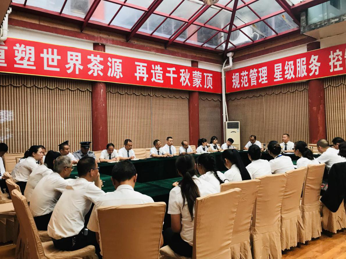 2019年9月10日下午,蒙頂山旅游公司總經(jīng)理衛(wèi)建勇在茶源堂主持召開主管及以上人員參加的8月份經(jīng)營情況分析會。會上傳達(dá)學(xué)習(xí)《四川省文化和旅游廳關(guān)于2019年全省A級景區(qū)復(fù)核檢查結(jié)果的通報(bào)》。各中心主任匯報(bào)了8月工作中存在的問題及下一步的措施,總經(jīng)理衛(wèi)建勇對各部門工作總結(jié)進(jìn)行點(diǎn)評并對8月份經(jīng)營管理、安全工作情況進(jìn)行了分析總結(jié)。安排部署了“中秋小長假”“國慶黃金周” 景區(qū)接待服務(wù)和安全保障工作。